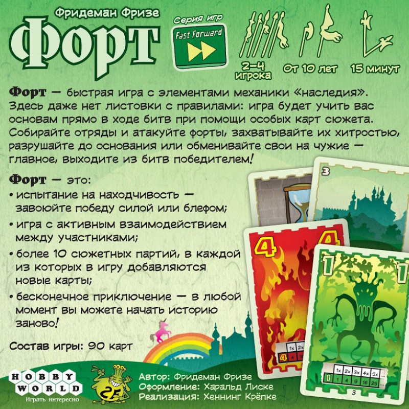 «Форт» — быстрая игра с элементами механики «наследия». Здесь даже нет листовки с правилами: игра будет учить вас основам прямо в ходе битв при помощи особых карт сюжета. Собирайте отряды и атакуйте форты, захватывайте их хитростью, разрушайте до основания или обменивайте свои на чужие — главное, выходите из битв победителем!