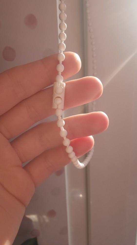 Шторы хорошие, плотные, свет не пропускают, повешала пока на двусторонний скотч, не падают, но есть одно но - мне, судя по всему попалась бракованная. Проблема в том, как расположен рулон. он должен быть поверх шторы и как бы разматываться вовнутрь (первое фото). а у меня он спрятан под шторой и разматывается наружу (второе фото). Не сказать, что это прям заметно, но из-за этого в верхнем углу штора топорщится и пропускает свет (третье фото). Плюс из-за этого при монтаже возникли проблемы, поскольку по инструкции, вешая цепь справа, нужно стоппер на ней поднимать на задний ряд (последние 2 фото), а мне пришлось снимать штору переделывать стоппер на передний ряд (из-за брака у меня вся конструкция идёт зеркально наоборот, и сделав как по инструкции, я просто не могла раскатать штору даже на треть стекла из-за этого стоппера)