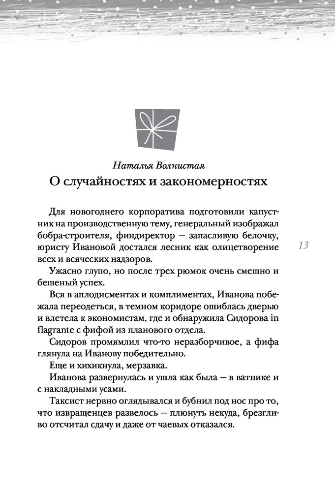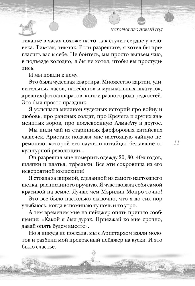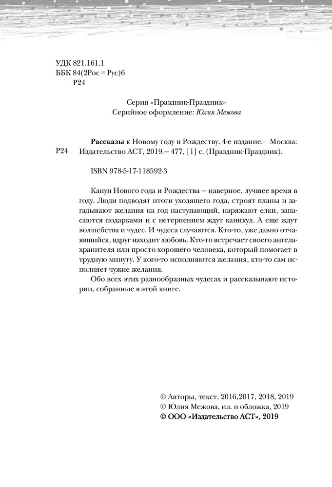Рассказы к Новому году и РождествуВ данный момент этот товар отсутствует в продаже. Возможно, у нас найдется аналогичный или похожий товар здесь. Серия: Праздник-Праздник Канун Нового года и Рождества — наверное, лучшее время в году. Люди подводят итоги уходящего года, строят планы и загадывают желания на год наступающий, наряжают елки, запасаются подарками и с нетерпением ждут каникул. А еще ждут волшебства и чудес. И чудеса случаются. Кто-то, уже давно отчаявшийся, вдруг находит любовь. Кто-то встречает своего ангела-хранителя или просто хорошего человека, который помогает в трудную минуту. У кого-то исполняются желания, кто-то сам исполняет чужие желания. Обо всех этих разнообразных чудесах и рассказывают истории, собранные в этой книге. |