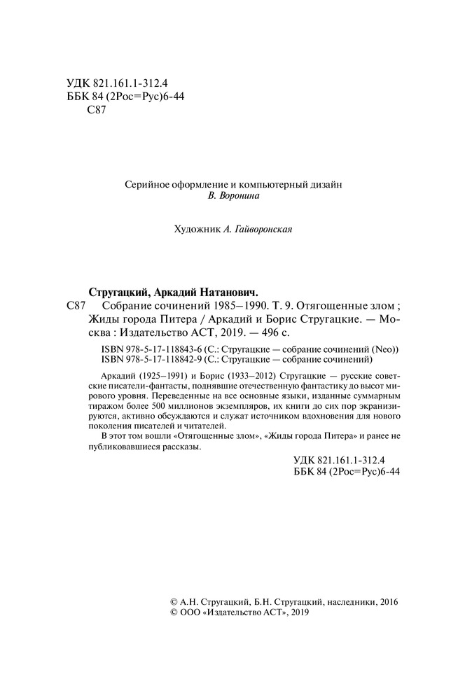В данный момент этот товар отсутствует в продаже. Возможно, у нас найдется аналогичный или похожий товар здесь. Серия: Стругацкие - собрание сочинений (Neo) Аркадий (1925–1991) и Борис (1933–2012) Стругацкие — русские советские писатели-фантасты, поднявшие отечественную фантастику до высот мирового уровня. Переведенные на все основные языки, изданные суммарным тиражом более 500 миллионов экземпляров, их книги до сих пор экранизируются, активно обсуждаются и служат источником вдохновения для нового поколения писателей и читателей. В этот том вошли «Отягощенные злом», «Жиды города Питера» и ранее не публиковавшиеся рассказы. |