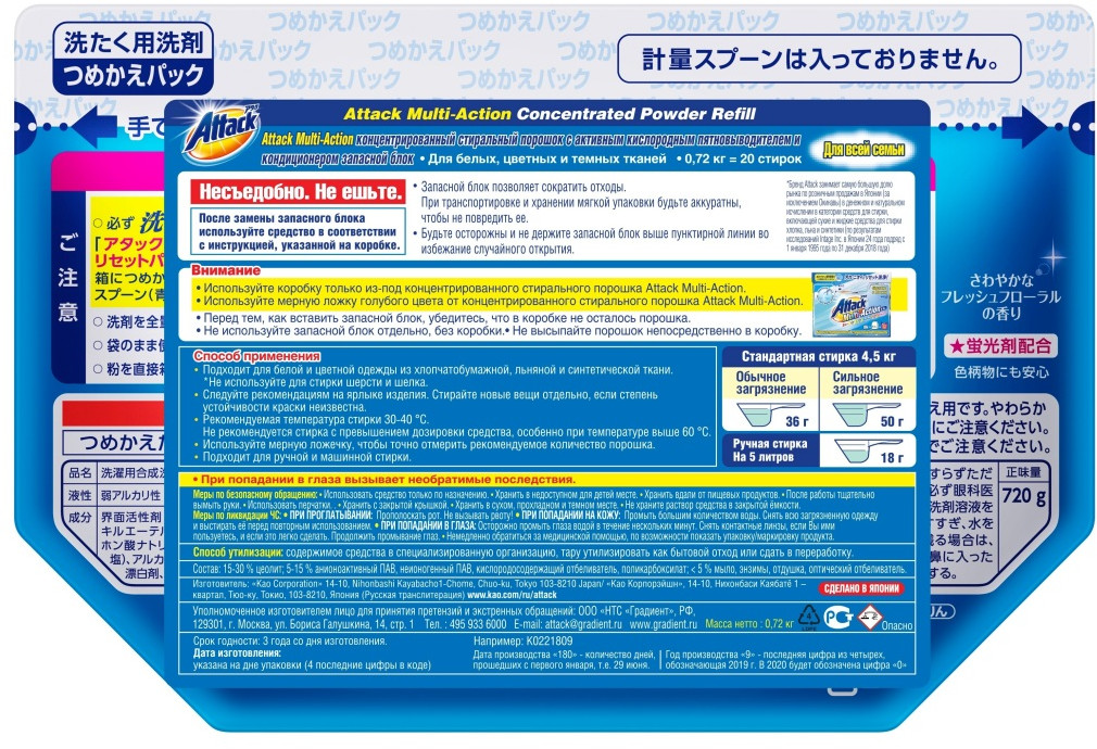 Attack Порошок стиральный антибактериальный с пятновыводителем и кондиционером (запасной блок)В данный момент этот товар отсутствует в продаже. Возможно, у нас найдется аналогичный или похожий товар здесь. Серия: Multi-Action Концентрированный стиральный порошок Attack «Multi-Action» с активным кислородным пятновыводителем и кондиционером подходит для стирки белой и цветной одежды из хлопчатобумажной, льняной и синтетической ткани, не подходит для стирки шерсти и шелка. Благодаря активному био-энзиму вымывает въевшуюся грязь, устраняет засаленность и неприятные запахи. Обладает нежным цветочным ароматом. |
