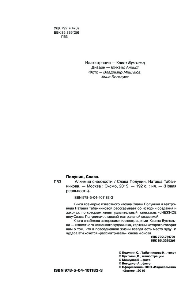 Алхимия снежностиСлава Полунин, Табачникова Наташа В данный момент этот товар отсутствует в продаже. Возможно, у нас найдется аналогичный или похожий товар здесь. Серия: Новая реальность Книга всемирно известного клоуна Славы Полунина и театроведа Наташи Табачниковой рассказывает об истории создания и законах, по живет удивительный спектакль «сНЕЖНОЕ шоу Славы Полунина», ставший театральной классикой. Книга снабжена авторскими иллюстрациями Квинта Бухгольца — известного немецкого художника, картины которого говорят нам о том что в повседневной жизни всегда есть место чудо. И чудеса эти хочется «рассматривать» снова и снова. |
