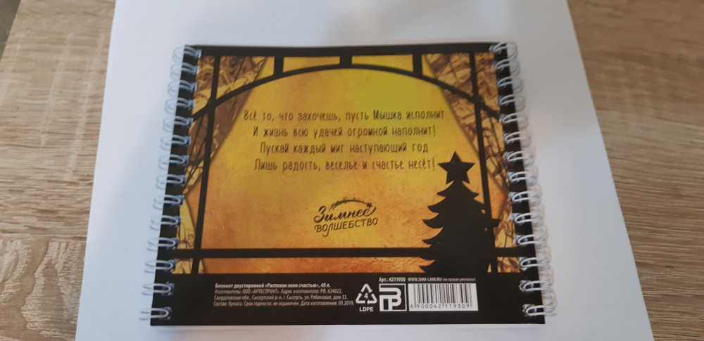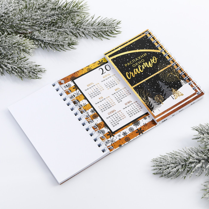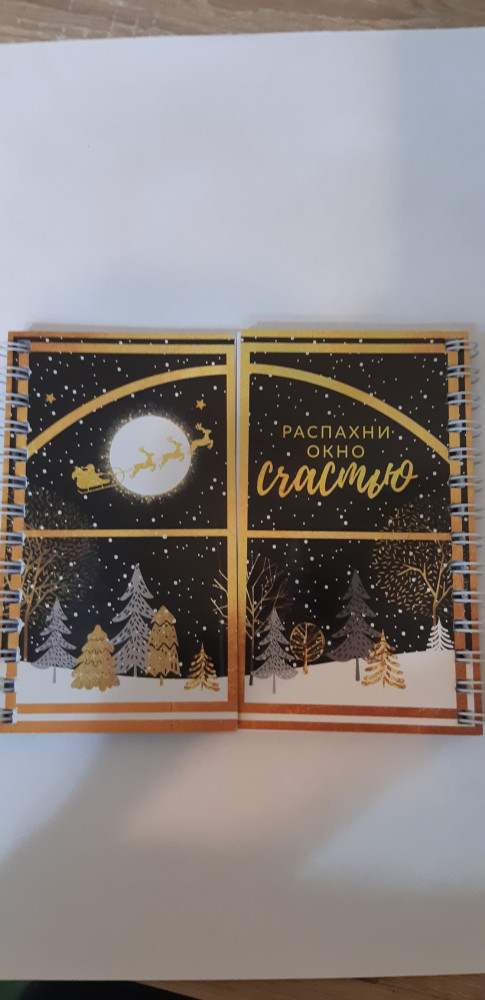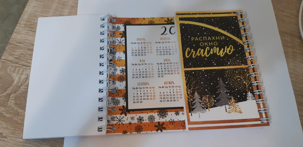 Блокнот очень красивый, с золотым тиснением, по центру разделён на две части, в центре календарь. Жаль, что мало поступило - на подарок самое то!