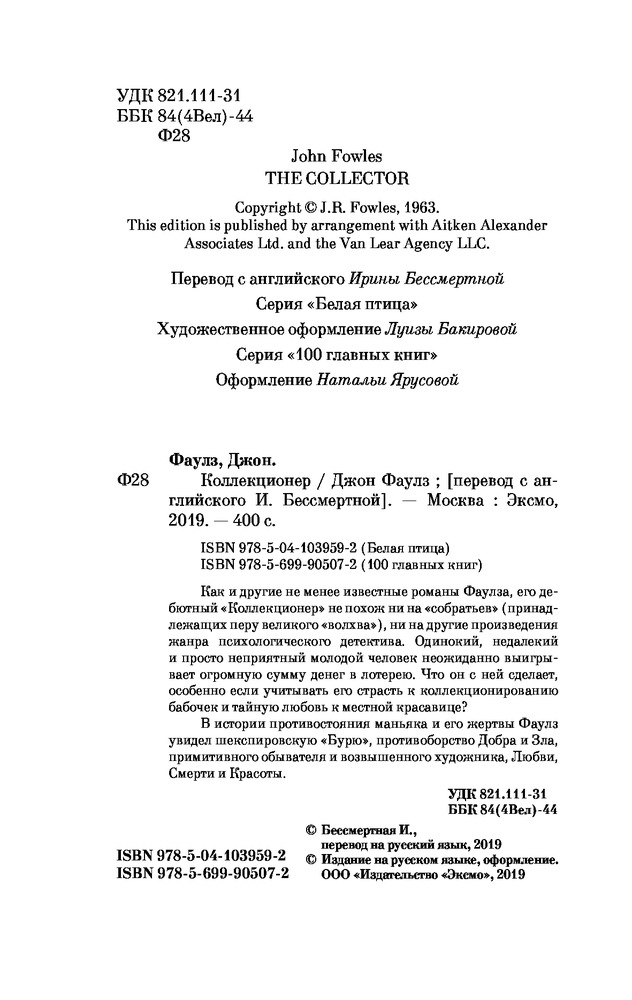 💳 Оплатить за товар можно при получении 🇰🇿 Есть бесплатная доставка по Казахстану 🎁 Копите бонусы с каждой покупки Серия: Белая птица Как и другие не менее известные романы Фаулза, его дебютный «Коллекционер» не похож ни на «собратьев» (принадлежащих перу великого «волхва»), ни на другие произведения жанра «психологического детектива». Одинокий, недалекий и просто неприятный молодой человек неожиданно выигрывает огромную сумму денег в лотерею. Что он с ней сделает, особенно если учитывать его страсть к коллекционированию бабочек и тайную любовь к местной красавице? В истории противостояния маньяка и его жертвы Фаулз увидел шекспировскую «Бурю», противоборство Добра и Зла, примитивного обывателя и возвышенного художника, Любви, Смерти и Красоты. |