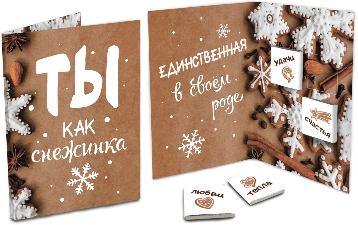 ChokoCat Открытка с шоколадом «Ты как снежинка»В данный момент этот товар отсутствует в продаже. Возможно, у нас найдется аналогичный или похожий товар здесь. Серия: Открытки Это новогоднее поздравление согреет самое ледяное сердце! Яркие и современные открытки, внутри которых 4 молочных шоколадки по 5 грамм. Каждая обернута в этикетку с оригинальной иллюстрацией. Молочный шоколад, 36,8% какао. |