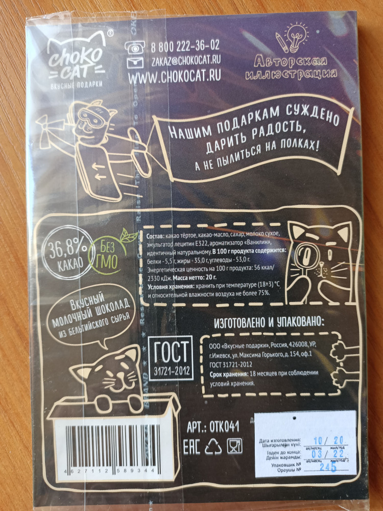 ChokoCat Открытка с шоколадом «Новый год это чудеса»В данный момент этот товар отсутствует в продаже. Возможно, у нас найдется аналогичный или похожий товар здесь. Серия: Открытки Высокая концентрация Новогоднего волшебства и радости в каждой шоколадке! Яркие и современные открытки, внутри которых 4 молочных шоколадки по 5 грамм. Каждая обернута в этикетку с оригинальной иллюстрацией. Молочный шоколад, 36,8% какао. |