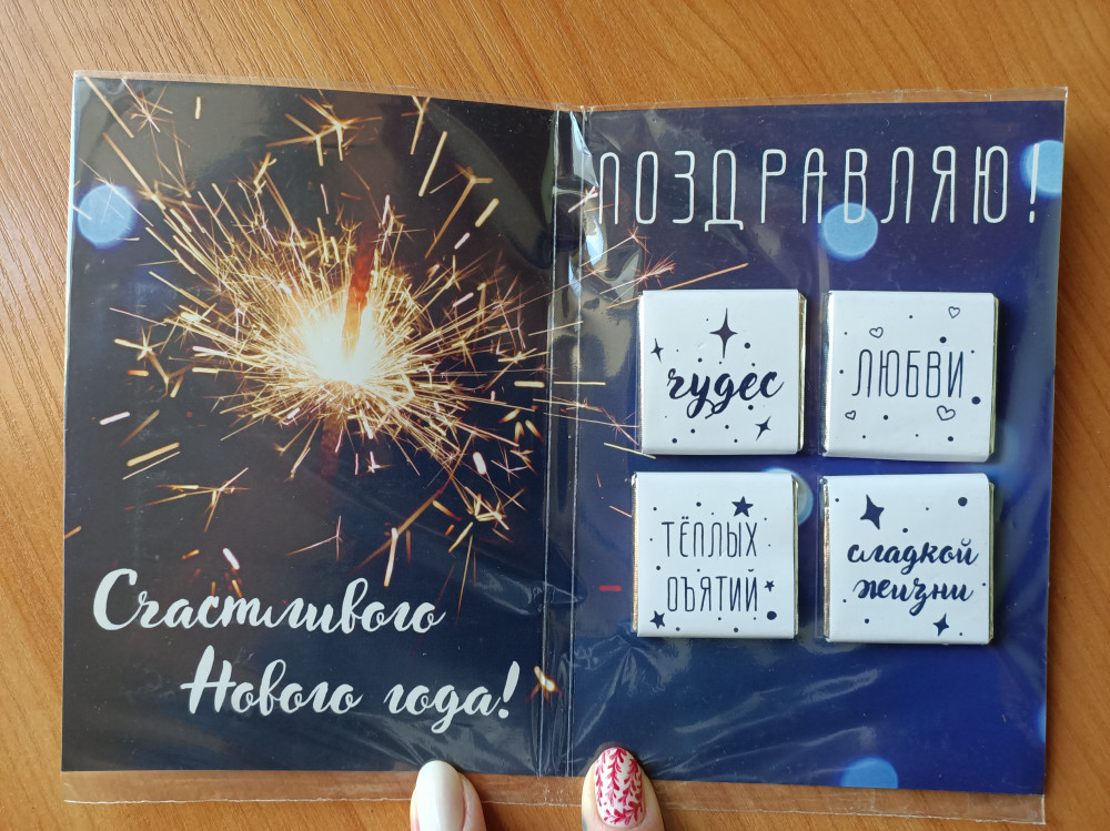Открытка необычная, новогодняя, праздничная. Внутри молочный шоколад. Но размер маленький. Я надеялась что будет побольше.