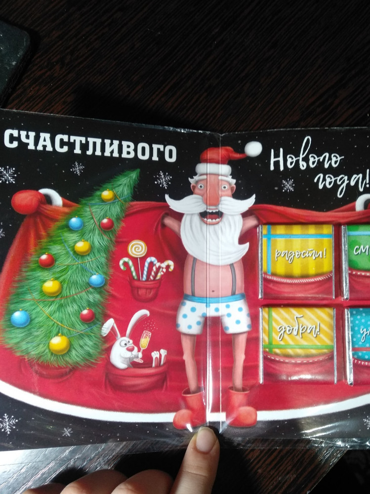 Брала на подарок .Пришли аккуратно упакованными.С серьезным видом рассмотрела не менее серьезного Деда Мороза на внешней стороне открытки..Раскрыла открыточку и...отличное настроение на весь день.Не ожидала такого от Деда. Смеялась весь день.
