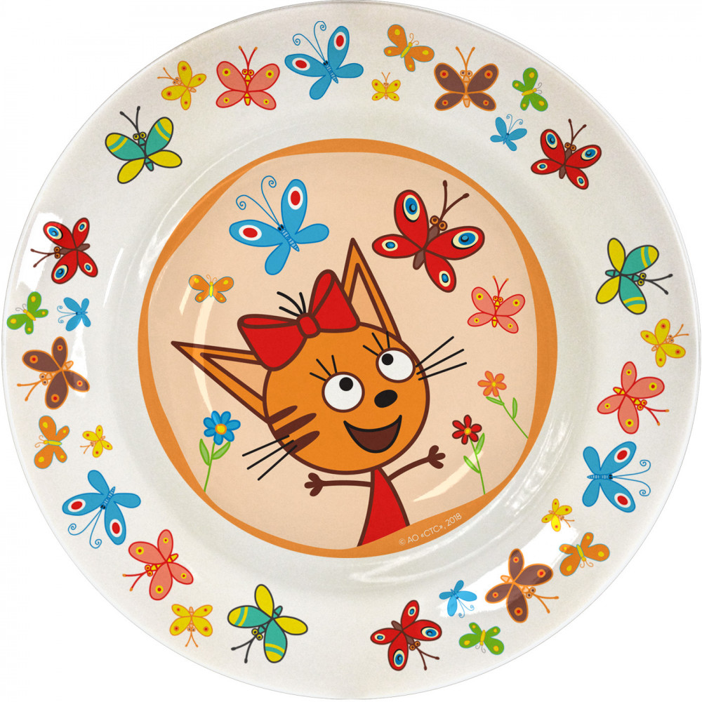 Тарелка диаметром 20 см. с изображением героини анимационного сериала «Три кота» — Карамельки. Мелкая тарелка с героями замечательного мультсериала «Три кота» отлично подойдет в качестве первой «взрослой» посуды малыша.