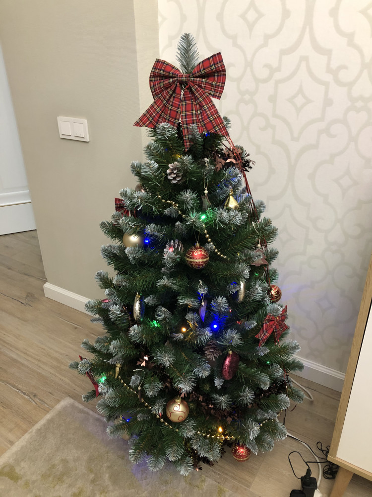 Достаточно яркий штрих на елке, взамен звезде на верхушке. Яркое тканевое украшение елки. Единственное что не понравилось - само крепление почему-то просто белая проволочка. Заказывала также бантики поменьше, так на них проволочка была оформлена празднично, золотистой мишурой, а тут такая белая, такие используют для перевязки проводов для техники. Достаточно заметная деталь, но в моем случае елка была у стенки, и это не бросалось в глаза