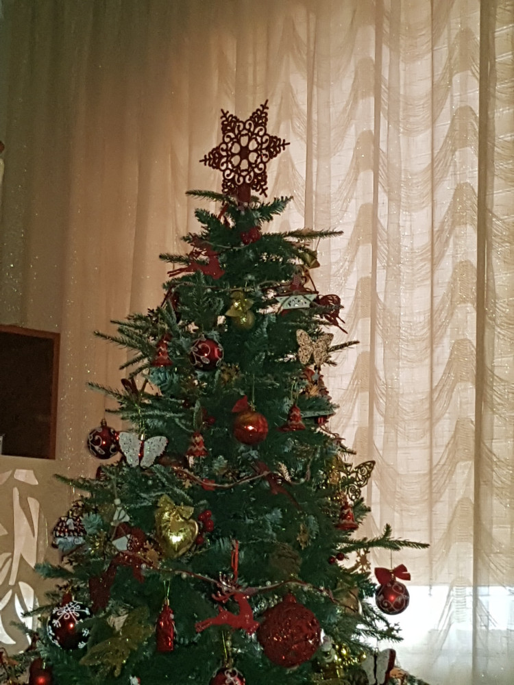 Верхушка красивая-узор резной и усыпан блестками. Высота 19 см - нормальная. Цвет настоящий красный, не осыпается. Мне очень понравилась!