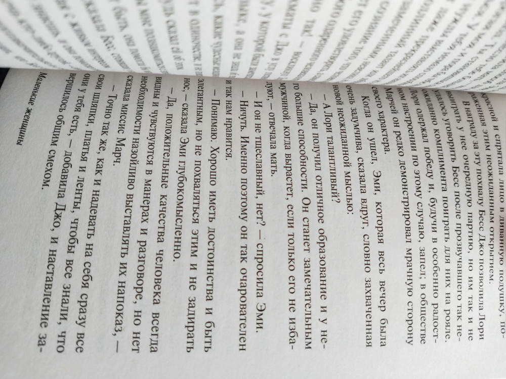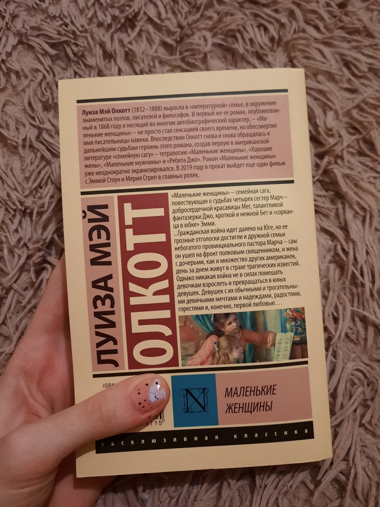 Прекрасная книги.В ней много хороших советов от миссис Марч. Для меня это лучшая книга моего 2020 года. Самая долгожданная, тёплая, искренняя, добрая. Можно назвать её справочником для молодых девушек. В ней нет притворства и наряду с классикой её можно отнести и немного к психологии.