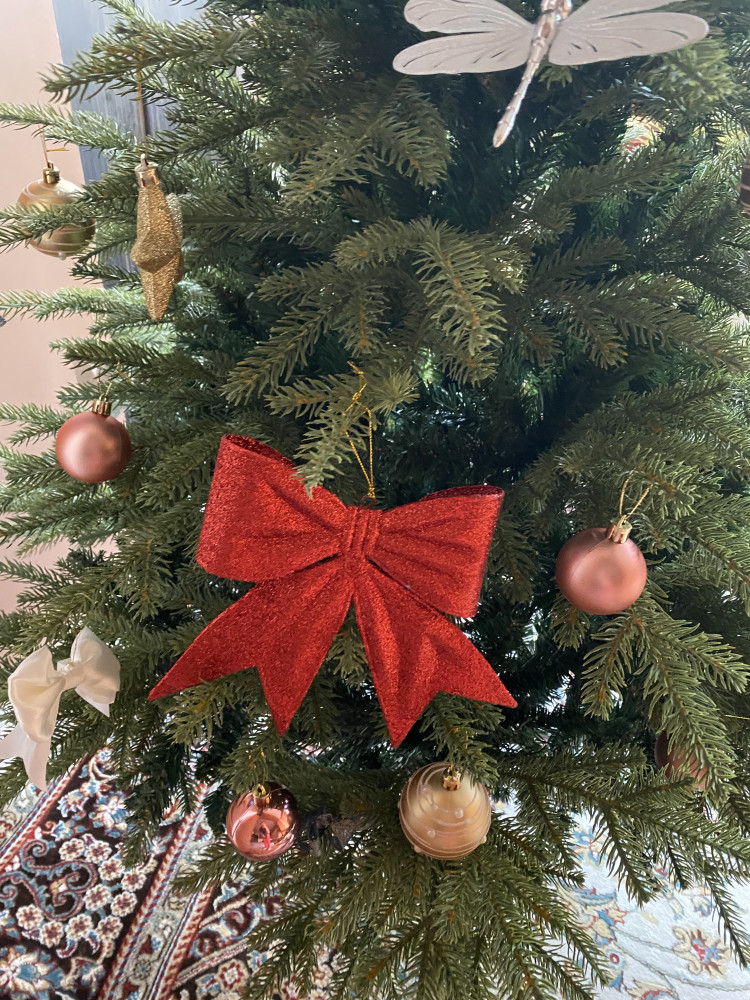 Бант очень большой. Особо не осыпается . Смотрится красиво. Решила использовать его в качестве украшения на верхушку елки, т.к. перетягивает внимание с остальных игрушек.