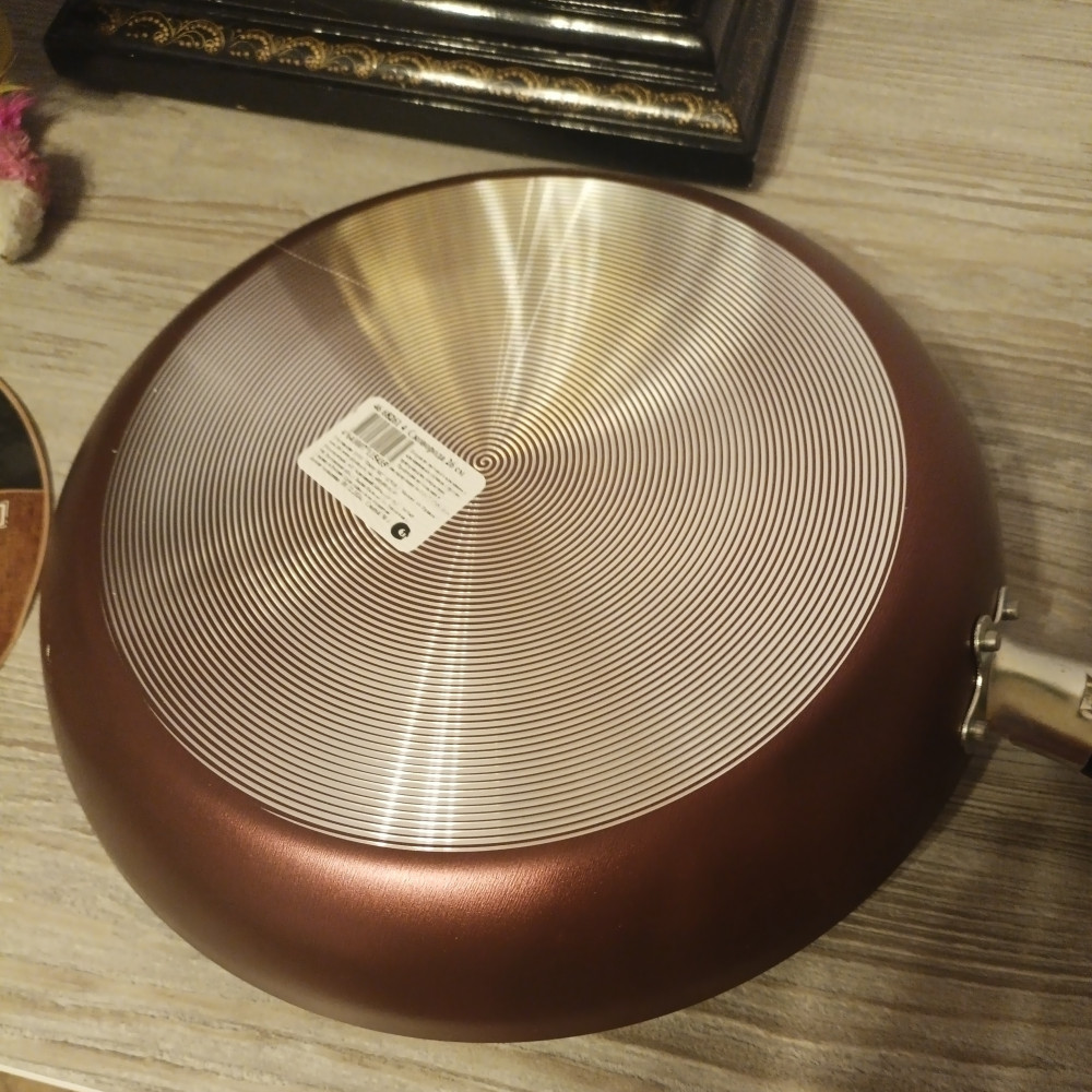 Это вторая Сковорода,первая меньшего размера. Легкая,немного не устойчевая на плите, но хорошо жарить. Взяла только потому, что тяжело уже держать чугунную сковороду в руках.