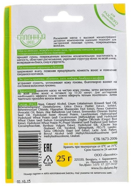 Способ применения: нанесите маску на чистую кожу головы, затем распределите по всей длине волос и оставьте на 15-20 минут. Для достижения наибольшего эффекта голову можно обернуть теплым полотенцем. Затем тщательно промойте волосы водой. |