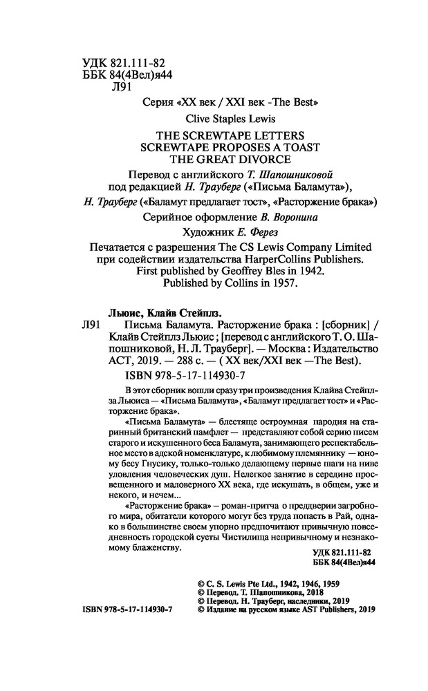 💳 Оплатить за товар можно при получении 🇰🇿 Есть бесплатная доставка по Казахстану от 1 дня 🎁 Копите бонусы с каждой покупки Серия: XX век / XXI век — The Best В этот сборник вошли сразу три произведения Клайва Стейплза Льюиса — «Письма Баламута», «Баламут предлагает тост» и «Расторжение брака». «Письма Баламута» — блестяще остроумная пародия на старинный британский памфлет — представляют собой серию писем старого и искушенного беса Баламута, занимающего респектабельное место в адской номенклатуре, к любимому племяннику — юному бесу Гнусику, только-только делающему первые шаги на ниве уловления человеческих душ. Нелегкое занятие в середине просвещенного и маловерного ХХ века, где искушать, в общем, уже и некого, и нечем... «Расторжение брака» — роман-притча о преддверии загробного мира, обитатели которого могут без труда попасть в Рай, однако в большинстве своем упорно предпочитают привычную повседневность городской суеты Чистилища непривычному и незнакомому блаженству. |