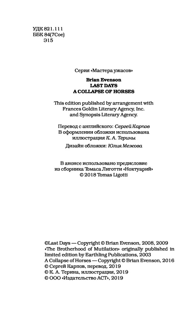 💳 Оплатить за товар можно при получении 🇰🇿 Есть бесплатная доставка по Казахстану от 1 дня 🎁 Копите бонусы с каждой покупки Серия: Мастера ужасов «Последние дни»: Бывшего полицейского Кляйна похищают адепты странной секты, в которой считают, что можно стать ближе к Богу при помощи ампутаций. Кто-то зарезал основателя их культа, и теперь Кляйн должен найти убийцу. Но в секте полно тайн, ее иерархия непроницаема, и даже простой допрос превращается в запутанный ребус. И чем дальше заходит Кляйн в своем расследовании, тем быстрее мир вокруг него превращается в кровавое наваждение, из которого, кажется, нет выхода. «Павшие кони»: Здесь в плюшевом медведе бьется сердце умершего ребенка, на Диком Западе грабитель спасается от правосудия, не зная, что его напарник, возможно, уже не совсем человек, неопытный турист сталкивается в странном приморском городе с непостижимым ужасом, на далекой планете группа старателей сходит с ума от вездесущей пыли, а реальность в любой момент может обернуться иррациональным кошмаром, который невозможно предсказать или усмирить. Все это миры Брайана Эвенсона, одного из самых нестандартных и изобретательных писателей, работающих сегодня в жанре хоррора. |