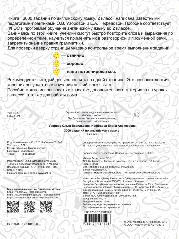 Книга «3000 заданий по английскому языку. 2 класс» написана известными педагогами-практиками О. В. Узоровой и Е. А. Нефёдовой, авторами более 700 учебных пособий для начальной школы. Материал пособия соответствует ФГОС и программе обучения английскому языку во 2 классе и даёт возможность ученикам быстро проверить свои знания по английскому языку. Учителя и родители могут отметить время, которое ребёнок затратил на выполнение заданий. На каждой странице дано контрольное время. Пособие можно использовать в качестве дополнительного материала на уроках в классе, а также для работы дома. Для начального образования.