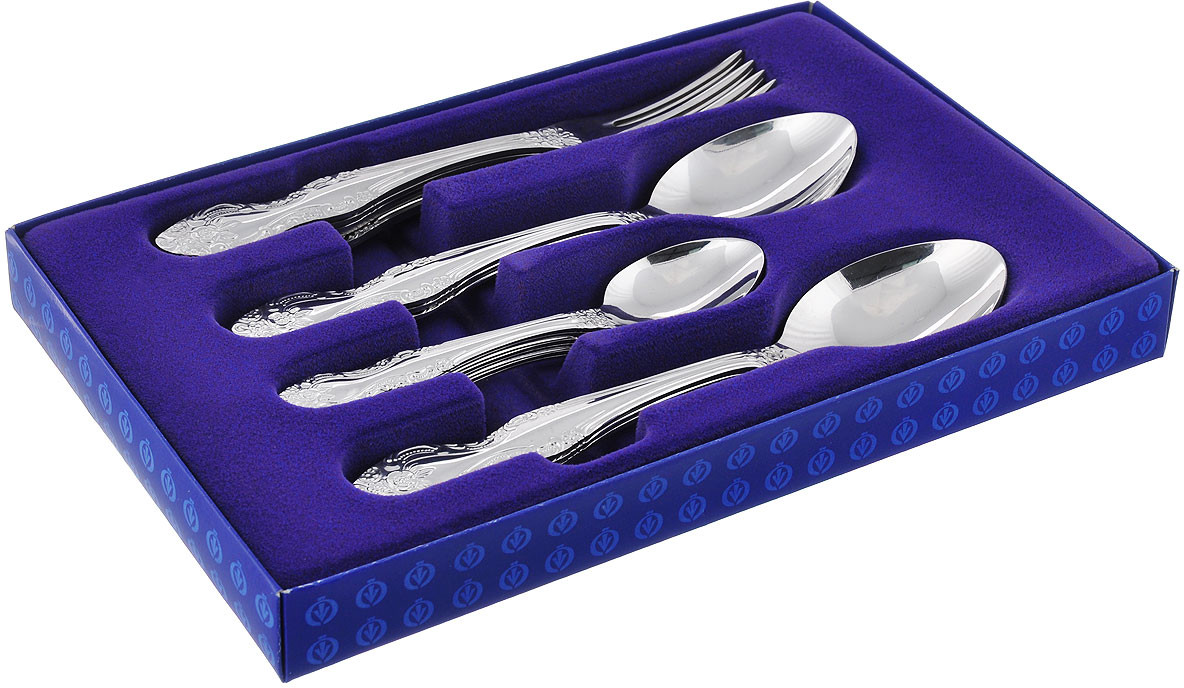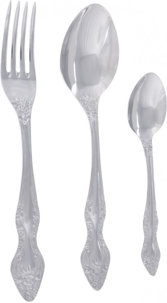 Набор столовых приборов «Тройка» изготовлен из высококачественной нержавеющей стали. В набор входит 6 столовых вилок, 6 столовых ложек и 6 чайных ложек. Приборы имеют элегантные ручки и украшены оригинальным узором.
