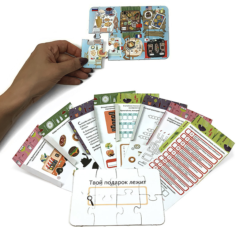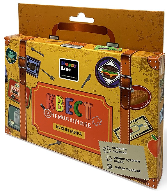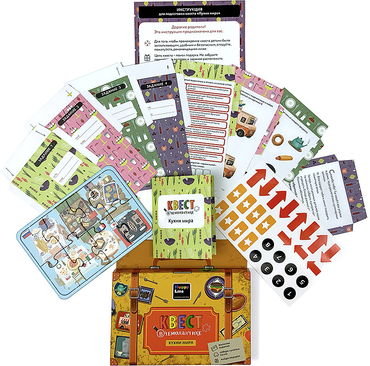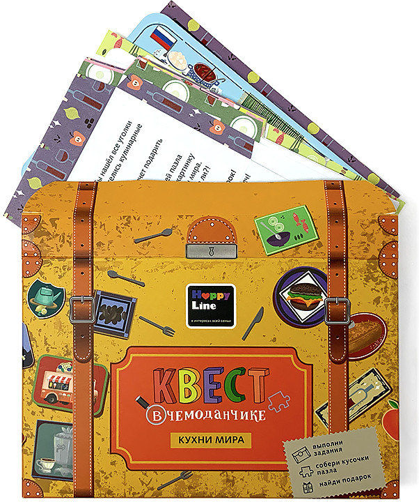 Для всех маленьких гурманов и любителей путешествий — квест в чемоданчике «Кухни мира». Прежде, чем удастся найти свой подарок, придется угадать блюда разных стран, вспомнить названия напитков, познакомиться с дешифратором и выполнить еще ряд увлекательных заданий.
