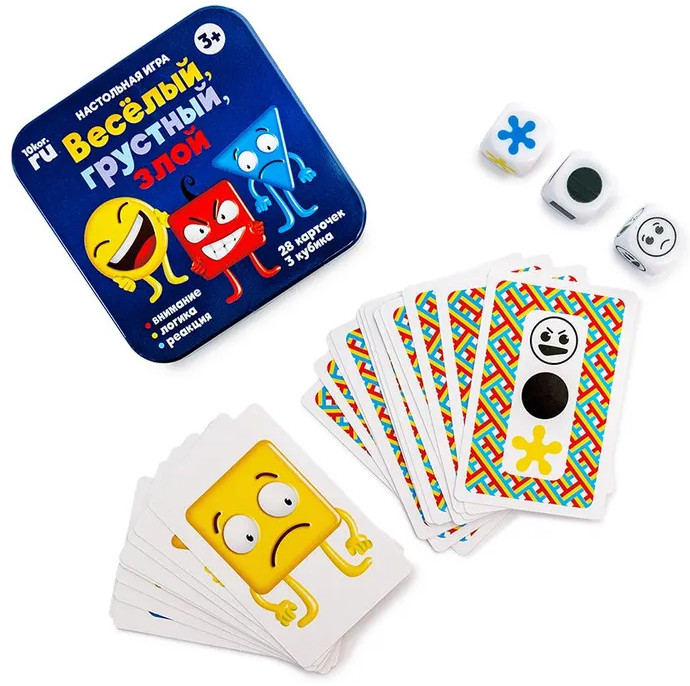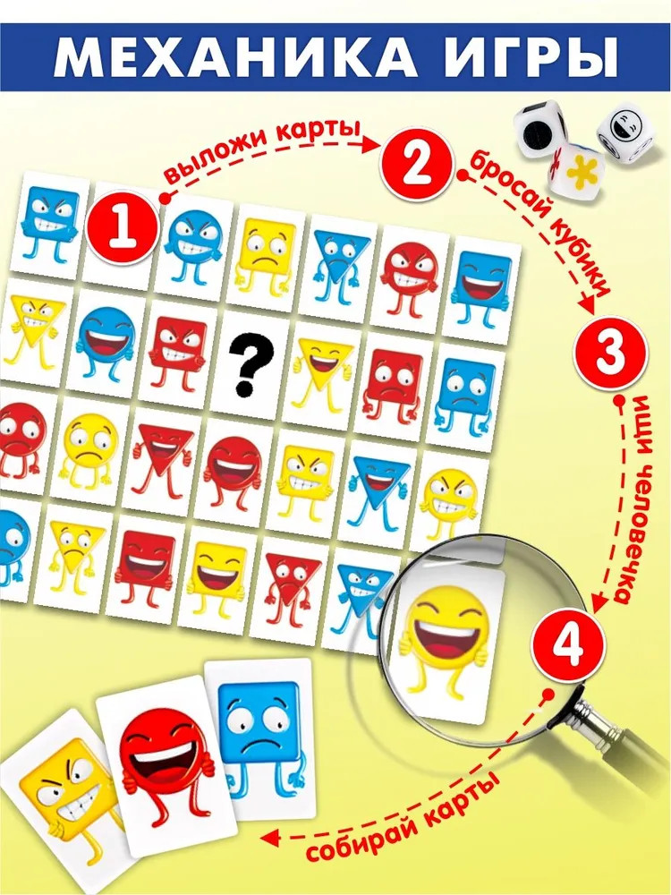 💳 Оплатить за товар можно при получении 🇰🇿 Есть бесплатная доставка по Казахстану от 1 дня 🎁 Копите бонусы с каждой покупки «Веселый, грустный, злой» — игра для самых быстрых и внимательных. Кубики подскажут, кого поймать: ищи нужного персонажа по форме, цвету и эмоции среди 27 забавных человечков. |