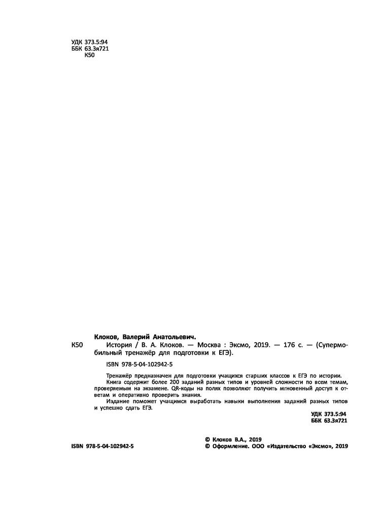 💳 Оплатить за товар можно при получении 🇰🇿 Есть бесплатная доставка по Казахстану от 1 дня 🎁 Копите бонусы с каждой покупки Серия: Супермобильный тренажер для подготовки к ЕГЭ (обложка) Тренажёр предназначен для подготовки учащихся старших классов к ЕГЭ по истории. Книга содержит более 200 заданий разных типов и уровней сложности по всем темам, проверяемым на экзамене. QR-коды на полях позволяют получить мгновенный доступ к ответам и оперативно проверить знания. Издание поможет учащимся выработать навыки выполнения заданий разных типов и успешно сдать ЕГЭ. |