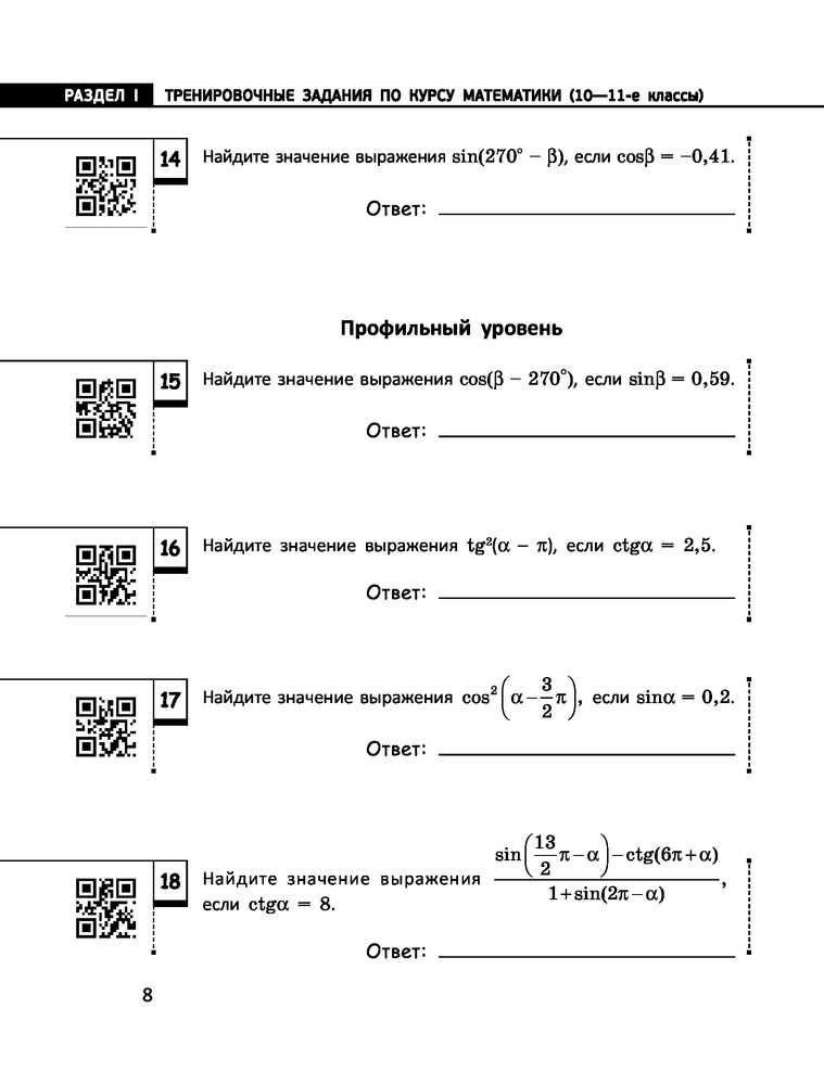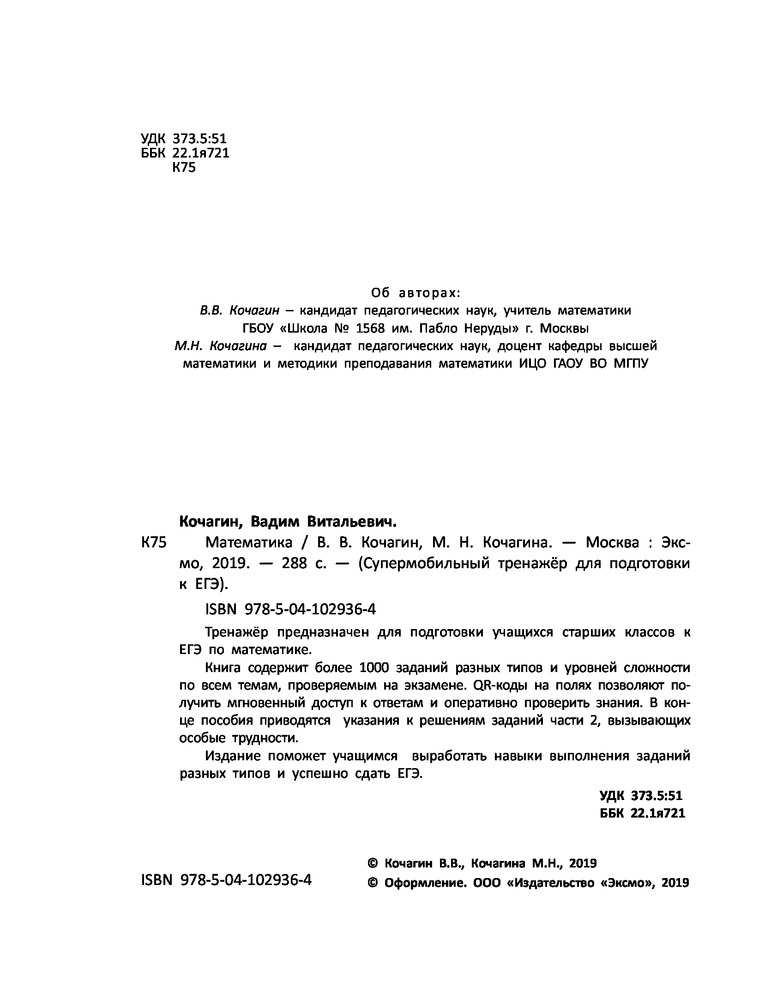МатематикаВадим Витальевич Кочагин, Мария Николаевна Кочагина В данный момент этот товар отсутствует в продаже. Возможно, у нас найдется аналогичный или похожий товар здесь. Серия: Супермобильный тренажер для подготовки к ЕГЭ (обложка) Тренажёр предназначен для подготовки учащихся старших классов к ЕГЭ по математике. Книга содержит более 1000 заданий разных типов и уровней сложности по всем темам, проверяемым на экзамене. QR-коды на полях позволяют получить мгновенный доступ к ответам и оперативно проверить знания. В конце пособия приводятся указания к решениям заданий части 2, вызывающих особые трудности. Издание поможет учащимся выработать навыки выполнения заданий разных типов и успешно сдать ЕГЭ. |