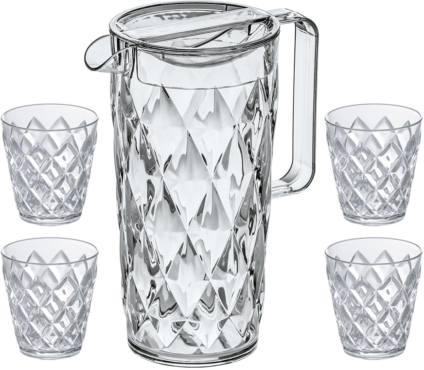 Коллекцию Crystal высоко оценят любители шумных вечеринок, семейных застолий и встреч с друзьями. Сверхлёгкая и ударопрочная посуда удобна в эксплуатации, поэтому она подходит для пикника или вечеринки в саду. Для изготовления кувшина и стаканов мастера Koziol используют экологически чистый полимер, который не содержит бисфенол-А и меламин. Благодаря этому материалу посуда поддерживает оптимальную температуру холодных напитков в течение длительного времени. Кувшин и стаканы можно мыть в посудомоечной машине.