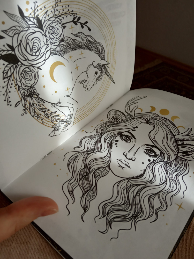 Получила его по акции 3+1, очень классный. Яркие странички с 4 видами разворотов. В серединке 2 картинки для раскрашивания - единорог и девушка-олень. Блокнотик тоненький, легкий. Очень удобно брать с собой.