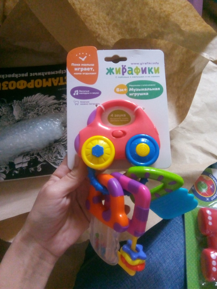 Соответствует описанию. Мелодии приятные. Купила дочери 6 мес - из за того что "ключики" тесно друг к другу висят особо не хотела играть, муж открыл машинку и вытащил ключики теперь дочка играет с удовольствием разглядывая каждую.