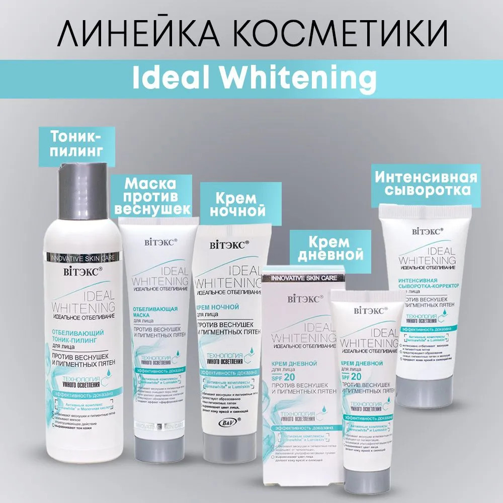 💳 Оплатить за товар можно при получении 🇰🇿 Есть бесплатная доставка по Казахстану от 1 дня 🎁 Копите бонусы с каждой покупки Серия: Ideal Whitening Отбеливающий тоник-пилинг выравнивает цвет кожи и минимизирует появление пигментных пятен. Благодаря уникальной технологии «умного» осветления компоненты глубоко проникают в кожу и прицельно воздействуют на участки, которым необходимо осветление. Активный комплекс Dermawhite® обеспечивает отбеливающий эффект, воздействуя на разные стадии процесса пигментации кожи, заметно осветляя веснушки и пигментные пятна. Молочная кислота оказывает мягкое отшелушивающее действие, стимулируя обновление кожи. Натуральный растительный экстракт толокнянки помогает снизить синтез меланина и минимизировать появление пигментных пятен. |