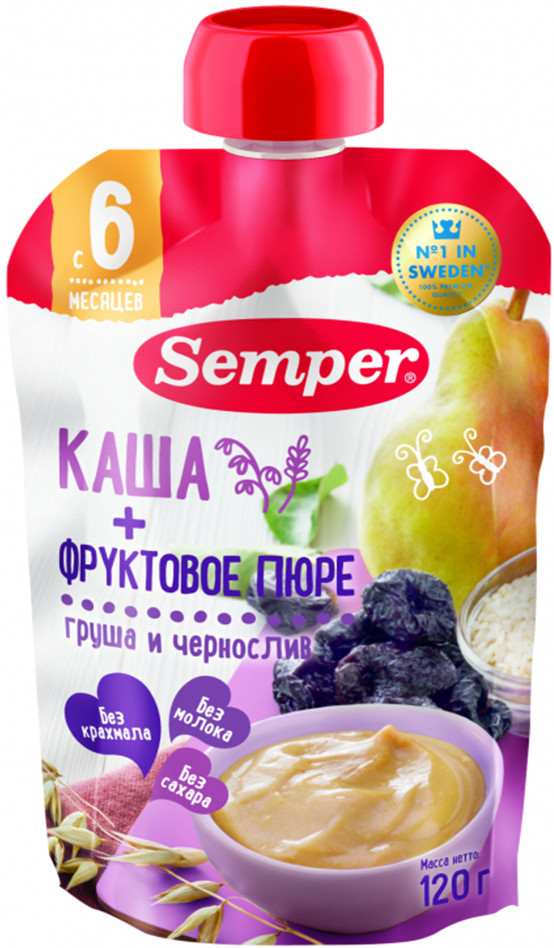 Semper Пюре фруктовое «Груша и чернослив»В данный момент этот товар отсутствует в продаже. Возможно, у нас найдется аналогичный или похожий товар здесь. Пюре Semper Груша, чернослив с кашей рекомендовано для рациона малышей с 6 месяцев. Благодаря практичной вакуумной упаковке пюре можно взять с собой, обеспечив ребенка полезным и вкусным питанием. Сочетание злаков и фруктов пюре хорошо насыщает и усваивается. Пюре содержит 100% натуральные фрукты и отборные злаки. Без крахмала. Без сахара. Готово к употреблению. Не требует разогрева. Вводить начиная с 0,5 чайной ложки 1 раз в день, постепенно увеличивая объем в соответствии с возрастом. Не разогревать упаковку в микроволновой печи |