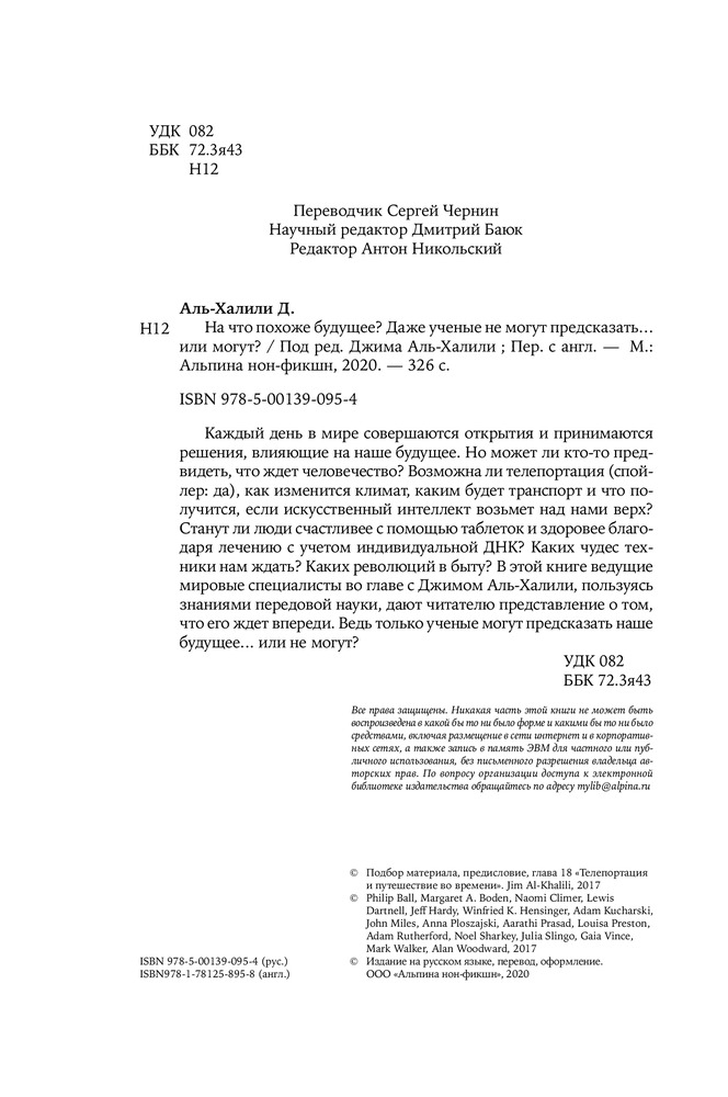 💳 Оплатить за товар можно при получении 🇰🇿 Есть бесплатная доставка по Казахстану от 1 дня 🎁 Копите бонусы с каждой покупки Серия: Естественные науки Каждый день в мире совершаются открытия и принимаются решения, влияющие на наше будущее. Но может ли кто‑то предвидеть, что ждет человечество? Возможна ли телепортация (спойлер: да), как изменится климат, каким будет транспорт и что получится, если искусственный интеллект возьмет над нами верх? Станут ли люди счастливее с помощью таблеток и здоровее благодаря лечению с учетом индивидуальной ДНК? Каких чудес техники нам ждать? Каких революций в быту? В этой книге ведущие мировые специалисты во главе с Джимом Аль-Халили, пользуясь знаниями передовой науки, дают читателю представление о том, что его ждет впереди. Ведь только ученые могут предсказать наше будущее... или не могут? |