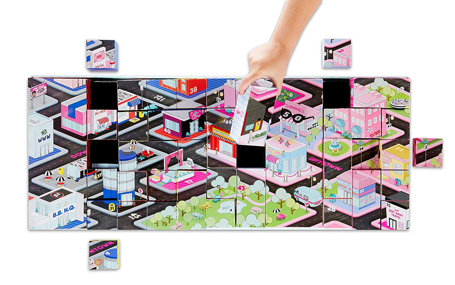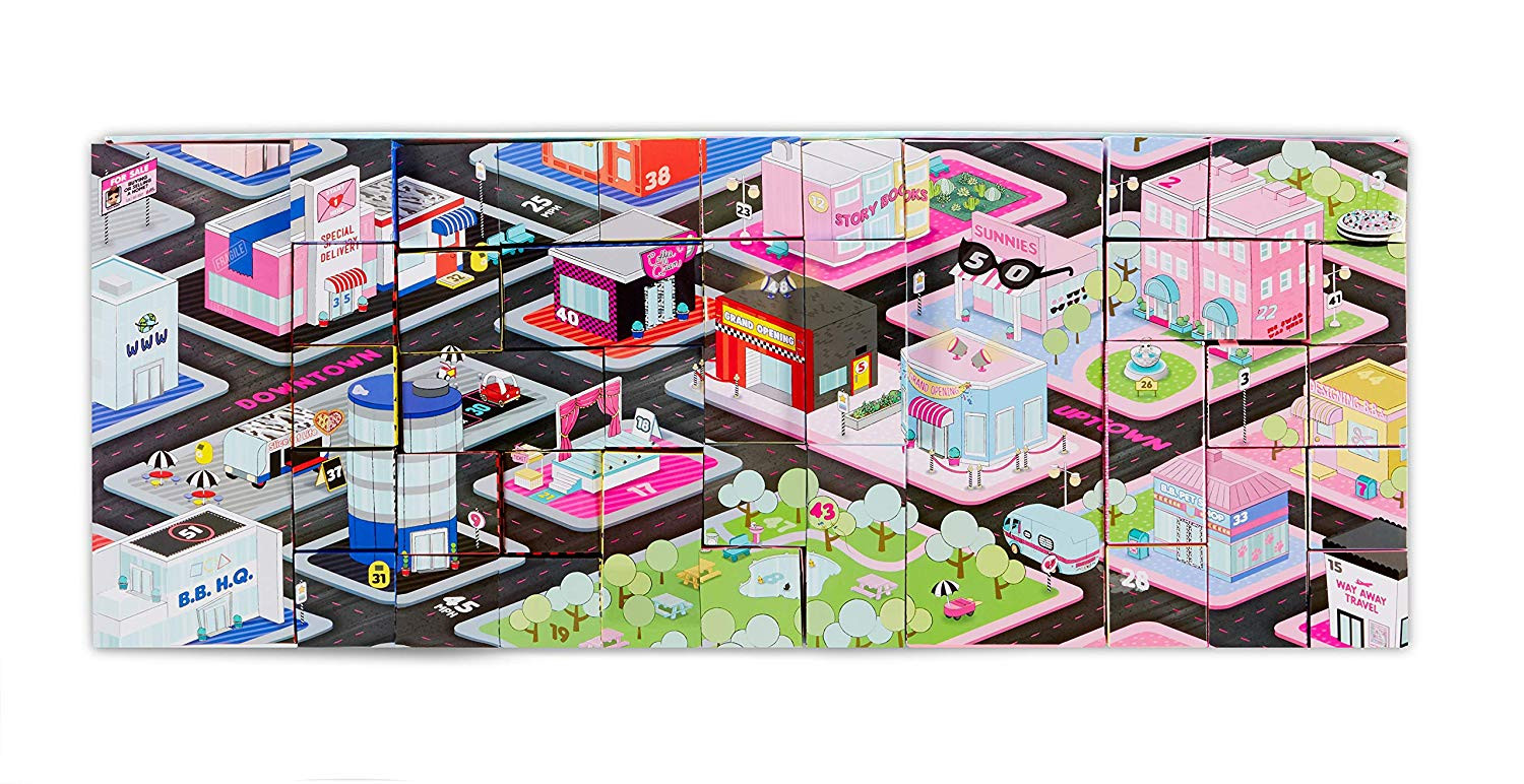 Внутри упаковки спрятаны более 70 секретных коробочек. Внутри каждой вы найдете эксклюзивные куколки, стильные аксессуары и комплекты одежды. Упаковки складываются в необычный городской лабиринт, в котором есть улицы, магазинчики, домики и уютные парки. Каждая закрытая коробочка пронумерована, и вам придется самим расшифровывать, как найти сюрпризы: открывать, снимать, поворачивать или вращать упаковку. Найдите два пластиковых магазинчика красного и синего цвета для каждой из больших куколок и ключи к ним. Соедини магазины вместе, чтобы разблокировать дверцы. Внутри можно складывать аксессуары.