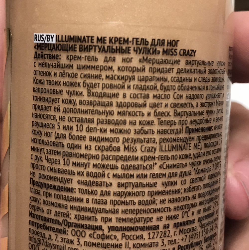 7Days Гель-крем для ног мерцающийВ данный момент этот товар отсутствует в продаже. Возможно, у нас найдется аналогичный или похожий товар здесь. Серия: Illuminate me Крем-гель для ног с мельчайшим шиммером, который придает деликатный золотистый оттенок и лёгкое сияние, маскируя царапины, ссадины и следы эпиляции. Кожа твоих ножек будет ровной и гладкой, будто облаченная в тончайшие капроновые чулки. Входящие в состав масло Сои надолго увлажняет и тонизирует кожу, возвращая здоровый цвет и свежесть, а экстракт Манго придает ей дополнительную мягкость и блеск. Виртуальные чулки легко наносятся, не оставляя разводов на коже. Теперь про неудобные и вечно рвущиеся 5 или 10 den-ки можно забыть навсегда! |