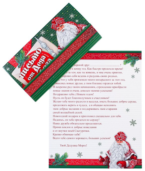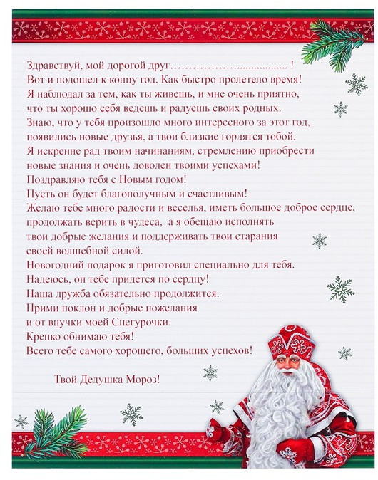 Красивое ,качественное письмо от Деда Мороза! Я вложила его в конверт с адресом от Деда Мороза и получателя ! Бросим в почту. Ребёнок ждёт с нетерпением. Хорошо бы и конверт приложить к этому письму! Спасибо!