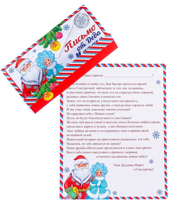 Письмо от Деда Морозаматериал картона письмо красочное оформление яркость В данный момент этот товар отсутствует в продаже. Возможно, у нас найдется аналогичный или похожий товар здесь. Серия: Новый год Как Дед Мороз узнает о том, какой подарок вы мечтаете получить? Конечно, с помощью новогоднего письма! Его яркий оригинальный дизайн привлечёт внимание получателя и он, непременно, исполнит ваше желание в первую очередь! Настоящий ответ от Деда Мороза можно получить только в случае, если послание будет отправлено по всем требованиям волшебной почты. Письмо нужно отправлять заранее (в начале декабря), ведь у дедушки и его преданных помощников так много работы, что они могут просто не успеть ответить всем ребятишкам вовремя. |