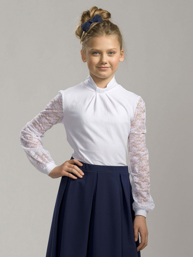 Нарядная трикотажная блузка с объемными рукавами и воротником из кружева. Богатство и красоту кружева дополняет лаконичный и необычный воротник — по переду выполнены бантовые складки, направленные к воротнику, сам кружевной воротник присобран по центру по типу банта.