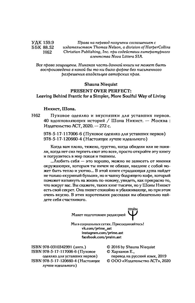 Серия: Пуховое одеялко для уставших нервов Когда вам плохо, тяжело, грустно, когда обидели или не поняли, когда нет сил терпеть «вот это все», просто откройте эту книгу и погрузитесь в мир покоя и тишины. ...Любить себя — это хорошо, можно не зависеть от мнения окружающих, которым ты ничем не обязан, наедине с собой может быть тепло и уютно... В этой книге страдающая душа найдет не только «куриный бульон», но и чашку бодрящего кофе, который поможет взглянуть на жизнь по-новому, увидеть, как прекрасно то, что вокруг вас. Вы скажете, таких книг тысячи, но у Шоны Никист есть свой секрет. Она пишет спокойно и убаюкивающе, но при этом очень вкусно. В этих коротеньких рассказах вы обязательно найдете себя счастливого. |