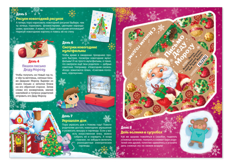 Самый классный календарь! Брала 2 разных календаря: тот,что нужно складывать конвертами на 64стр (31 письмо на каждый день с заданиями) и этот на 20стр. Этот интереснее. Глянцевые страницы, абсолютно все интересные задания, наклейки и календарь в виде ёлочки, стихотворение легко выучить и письмо для Деда Мороза очень красиво сделано, даже можно запечатать специальной наклейкой. Всё продумано, несмотря на всего 20 страниц.