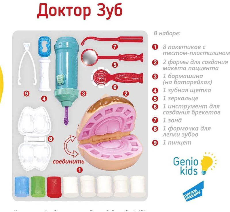 💳 Оплатить за товар можно при получении 🇰🇿 Есть бесплатная доставка по Казахстану от 1 дня 🎁 Копите бонусы с каждой покупки Поход к зубному врачу — не самое приятное занятие. Но чтобы научить ребенка отважно справляться с этим — дайте ему возможность самому почувствовать себя в роли доктора вместе с набором Genio Kids — Доктор Зуб! |