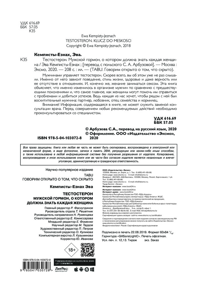 Тестостерон. Мужской гормон, о котором должна знать каждая женщинаВ данный момент этот товар отсутствует в продаже. Возможно, у нас найдется аналогичный или похожий товар здесь. Серия: TABU. Говорим открыто о том, что скрыто Мужчинами управляет тестостерон. Скорее всего, вы об этом уже не раз слышали. Именно от него зависит поведение, стиль жизни, здоровье и даже верность или ее отсутствие в отношениях. И, конечно же, желание заниматься сексом. Эта книга объясняет, что именно изменилось в организме мужчин по сравнению с предшествующими поколениями и, что самое главное, как женщины могут помочь им справиться с проблемами и добиться успехов. Ведь каждая из нас хочет, чтобы рядом с ней был восхитительный мужчина: партнер, любовник, отец семейства и кормилец. |