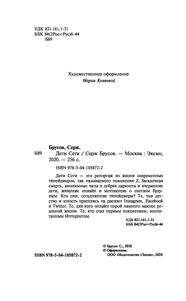 Дети СетиВ данный момент этот товар отсутствует в продаже. Возможно, у нас найдется аналогичный или похожий товар здесь. Серия: Young Adult. Свой характер. Серж Брусов Дети Сети — это репортаж из жизни современных тинейджеров, так называемого поколения Z. Загадочная смерть, анонимные чаты в дебрях даркнета и вчерашние дети, живущие онлайн и мечтающие о светлом будущем. Кто они, сегодняшние тинейджеры? Те, чьи детство и юность пришлись на расцвет Instagram, Facebook и Twitter. Те, для кого онлайн порой намного важнее реальной жизни. Те, кто стал первым поколением, воспитанным Интернетом. |