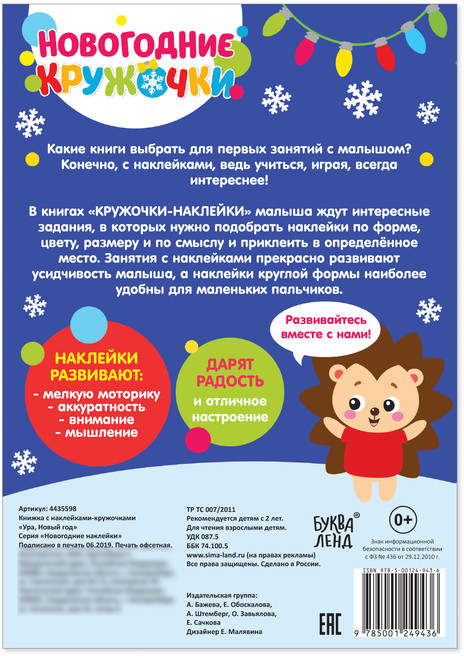 Наклейки «Новогодние кружочки. Ура, Новый год»В данный момент этот товар отсутствует в продаже. Возможно, у нас найдется аналогичный или похожий товар здесь. Серия: Новогодние книги Буква-Ленд Новогодние кружочки — это книга для весёлых занятий с малышом. Это несложное и увлекательное занятие развивает мелкую моторику рук, сенсорное восприятие, внимание, терпение и усидчивость малыша, подарит ощущение праздника. |