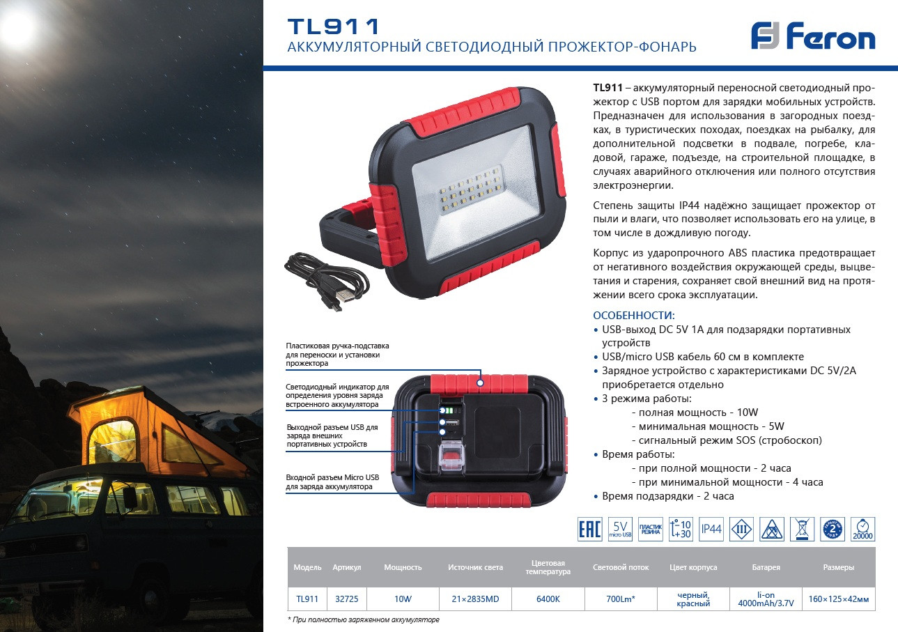 Feron Прожектор светодиодный аккумуляторный TL911В данный момент этот товар отсутствует в продаже. Возможно, у нас найдется аналогичный или похожий товар здесь. Аккумуляторный светодиодный прожектор-фонарь оснащен USB портом для зарядки мобильных устройств. Степень защиты IP44 надежно защищает прожектор от пыли и влаги, что позволяет его использовать и в помещении, и на улице в любую погоду. Корпус из ударопрочного ABS пластика защищает от негативного воздействия окружающей среды, выцветания и старения, сохраняет свой внешний вид на протяжении всего периода эксплуатации. В корпусе предусмотрена пластиковая ручка-подставка для переноски и установки прожектора. Также есть индикатор для определения уровня заряда встроенного аккумулятора. |