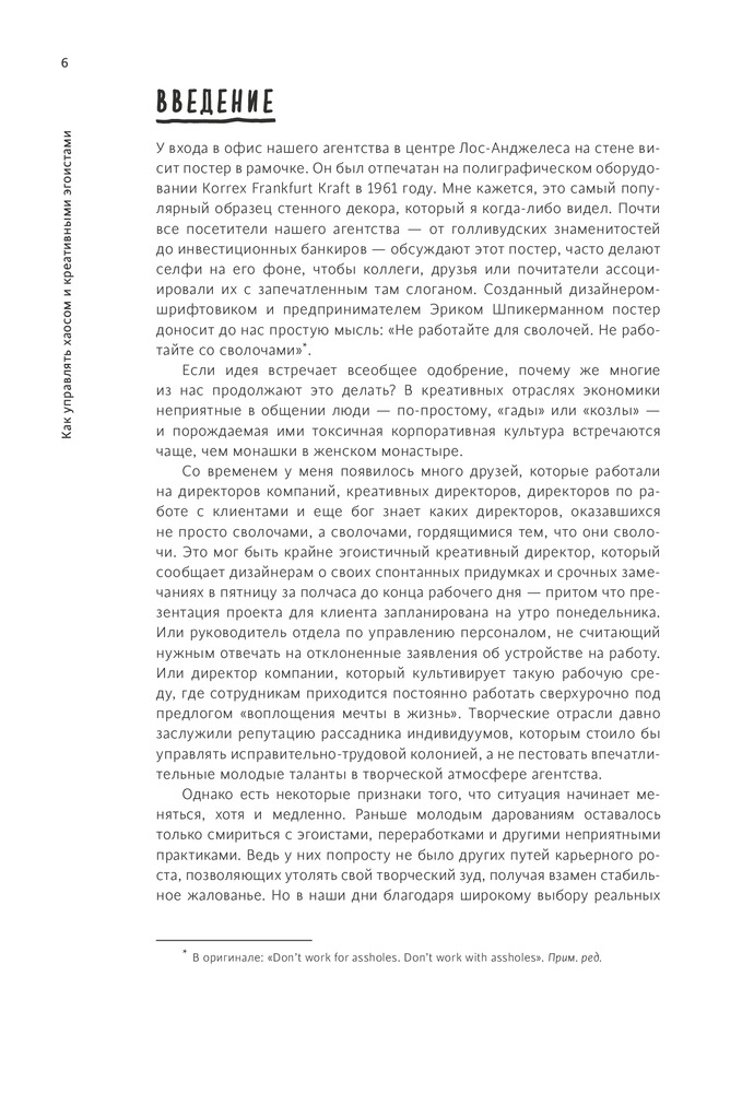 Эта книга — откровенное, веселое чтение для всех креативщиков: директора или помощника, в креативном агентстве или со стороны клиента, работающего в дизайне, рекламе, публикации, моде или киноиндустрии. Книга полна анекдотов, блок-схем самоанализа, упражнений и планов действий по совершенствованию методов работы. Простые стратегии могут быть легко реализованы для создания более счастливой, более продуктивной команды и — что важно — лучшей работы! |