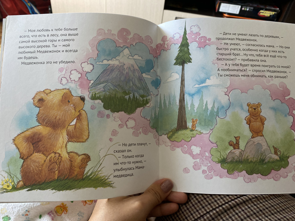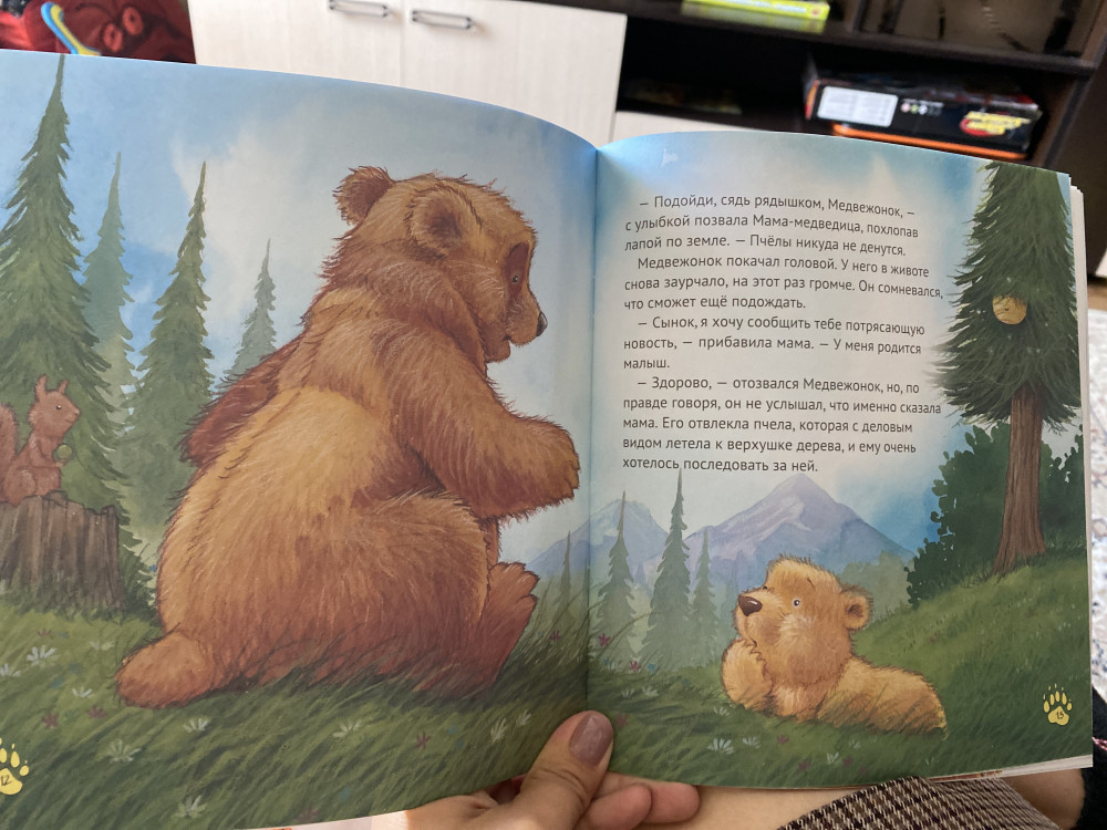 Отлично изданная книжка, переплёт глянцевый, тонкий картон. Книжка красочная, рисунки реалистичные, красивые. В конце книжки - советы, как использовать текст книжки в воспитании ребёнка. Например, приведен рисунок генеалогического дерева и советы, как поработать с ним. Например, нарисовать на таком дереве семью медведей и свою семью.