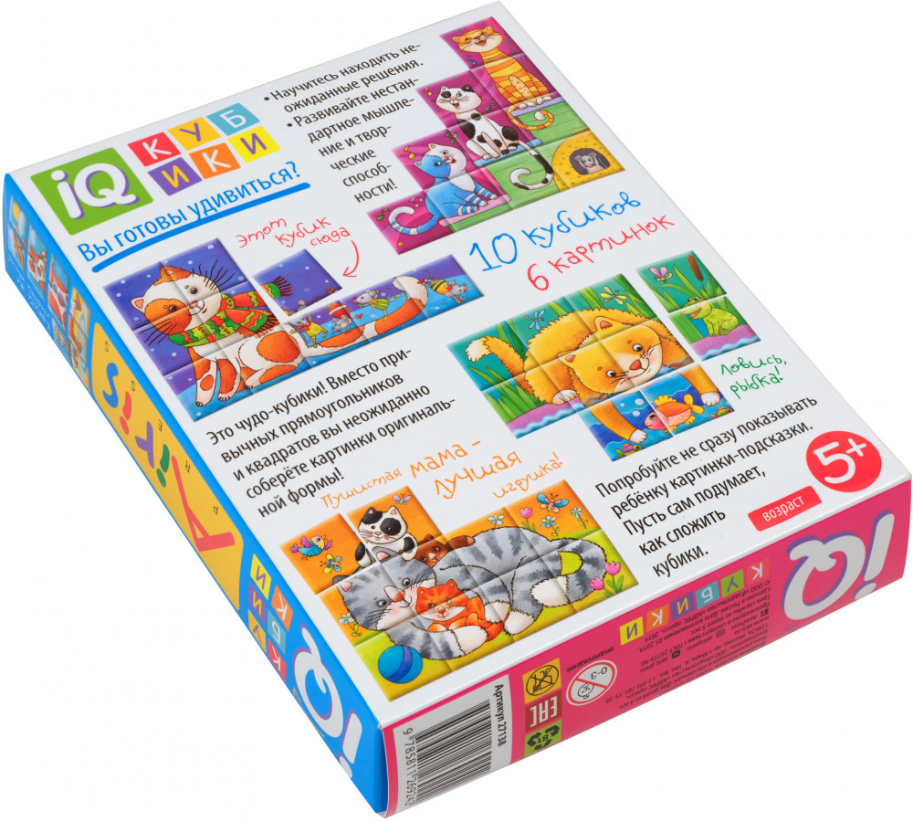 💳 Оплатить за товар можно при получении 🇰🇿 Есть бесплатная доставка по Казахстану от 1 дня 🎁 Копите бонусы с каждой покупки Серия: IQ Кубики Эта игра поможет ребёнку творчески взглянуть на мир. Набор состоит из 10 кубиков. Ребёнку нужно сложить картинку из 10 фрагментов. Но особенность данных кубиков в том, что они складываются не в форме привычного прямоугольника, а в виде различных фигур. В качестве подсказки даны 6 картинок с изображением весёлых котиков. Во время игры происходит знакомство с понятиями «часть» и «целое», развивается умение нестандартно мыслить и работать по образцу. Наклейки на кубики сделаны из качественной гладкой бумаги, которая не портится от игры. |