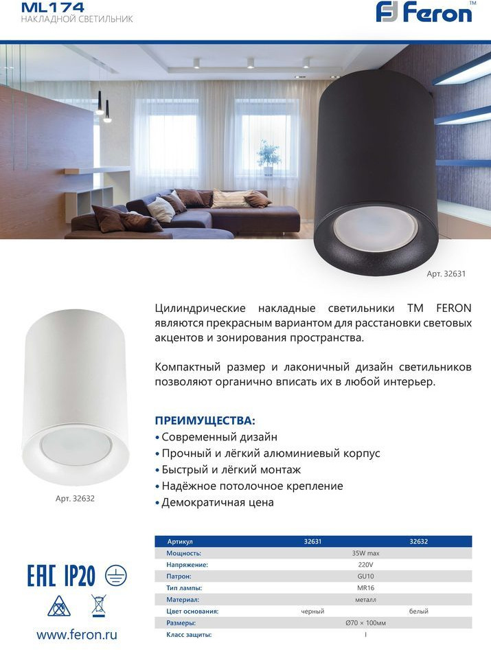 Декоративный накладной светильник в белом компактном корпусе ТМ Feron серии ML174 MR16 широко используется в коммерческом, жилом, офисном и административном, общественном и муниципальном сегментах освещения. Отлично подходит для создания акцентного освещения для привлечения внимания к определённым зонам или предметам, а также для эффективного зонирования пространства. Модель выполнена из качественных и долговечных комплектующих, не подверженных коррозии, старению и деградации. Удобные универсальные крепежи обеспечивают качественный и быстрый монтаж изделия.