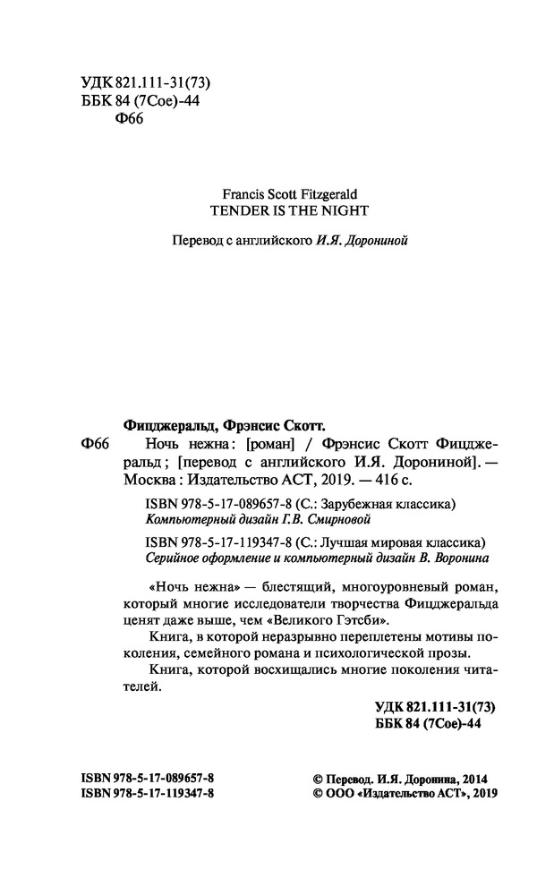 💳 Оплатить за товар можно при получении 🇰🇿 Есть бесплатная доставка по Казахстану от 1 дня 🎁 Копите бонусы с каждой покупки Серия: Лучшая мировая классика «Ночь нежна» — во многом автобиографичный роман, который сам Фицджеральд называл своим любимым произведением, а многие критики оценили выше «Великого Гэтсби». Это роман — история непростых взаимоотношений юной амриканской актрисы Розмари, молодого талантливого врача-психиатра Дика Дайвера и его жены Николь, чья болезнь — драма самого Фицджеральда (его жена Зельда страдала шизофренией). Это роман о любви, страсти, желании сохранить брак, отчаянии и самообмане, в котором за судьбой отдельных героев просматривается облик целой эпохи. |